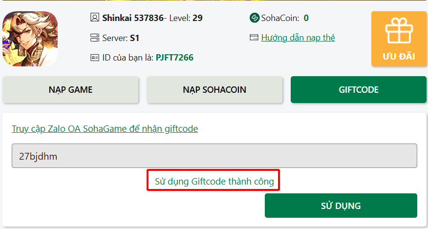 Bước 4: Sau khi sử dụng mã quà sẽ hiện thông báo, Cơ Trưởng kiểm tra hòm thư nhé!