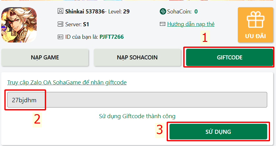 Bước 3: Bấm vào mục "GIFTCODE" > Nhập mã quà tặng > Bấm Sử Dụng
